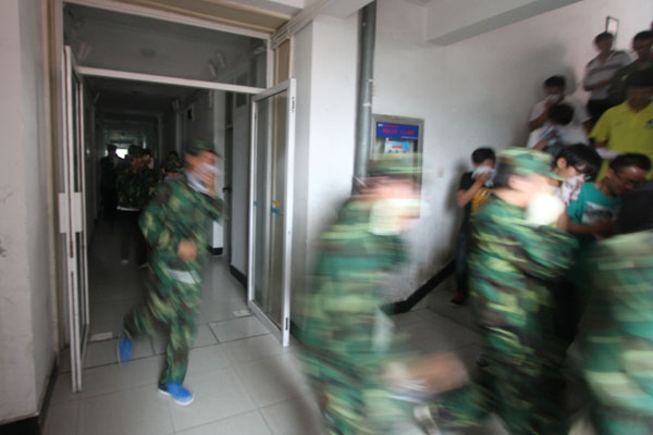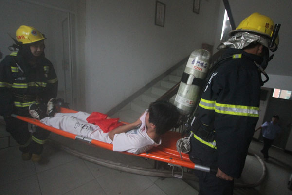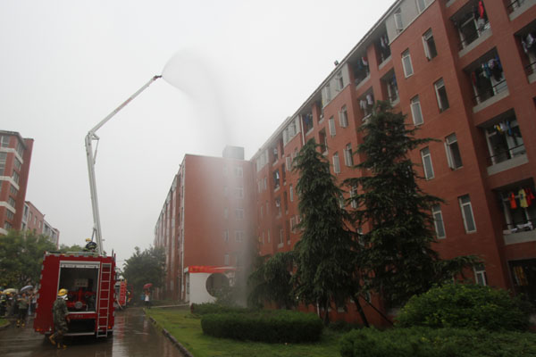 15:19分,消防演练警报准时拉响,学生宿舍楼某房间内冒出滚滚浓烟,被困人员在阳台进行呼救,楼内所有人员紧急向安全地点疏散,3分钟内全楼人员疏散完毕。10名消防队员携带各种灭火及防护装备,从一楼紧急向火灾起火点铺设水管,消防高喷车紧急架设、升高,对准起火房间进行喷水灭火,几分钟后火苗被扑灭,被困人员被消防队员用担架紧急救出。
