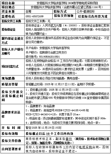 安徽医科大学临床医学院2#3#教学楼电缆采购项目招标公告