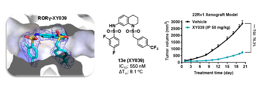 在核受体药物研发领域,他所在的团队取得了突破性进展:针对前列腺癌及其耐药问题,发现核受体RORγ是全新治疗靶标,并主导设计了小分子抑制剂XY101。该抑制剂不仅具有高选择性和口服生物利用度,还能有效克服传统药物的耐药性,目前已转让给广州智药生物科技有限公司,进入1类新药研发阶段。