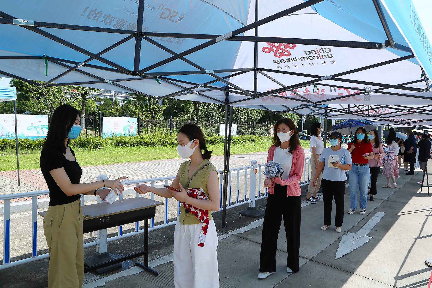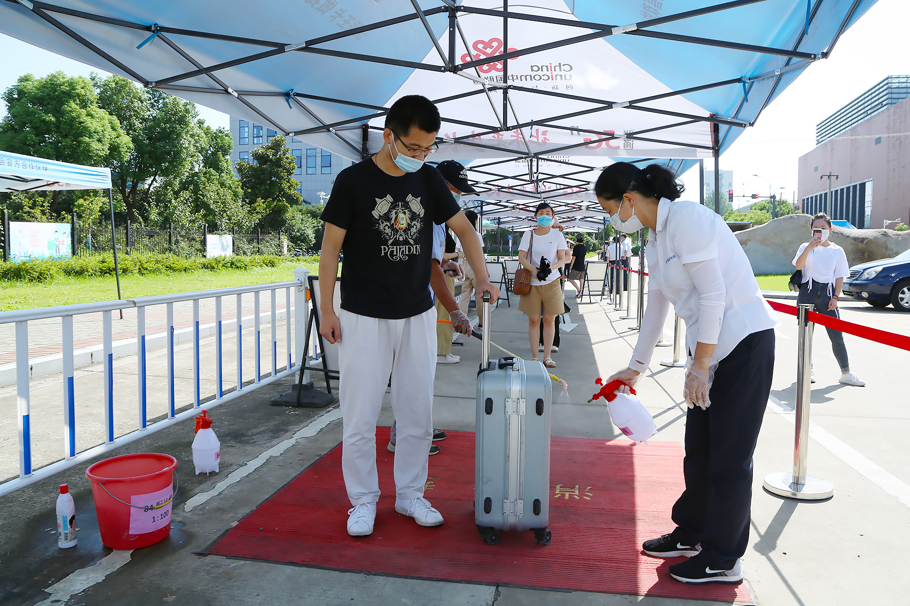 在学生返校报到场景演练中,设立入校通道、身份核验点、测温点、行李消杀点、应急处置点,返校学生手持健康码(绿码)、行程卡(绿码)、核酸检测证明,保持安全距离,在工作人员的引导下分别进行体温检测、行李消杀、定点报到,重点模拟演练了异常情况的应急处置。