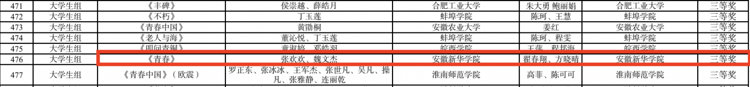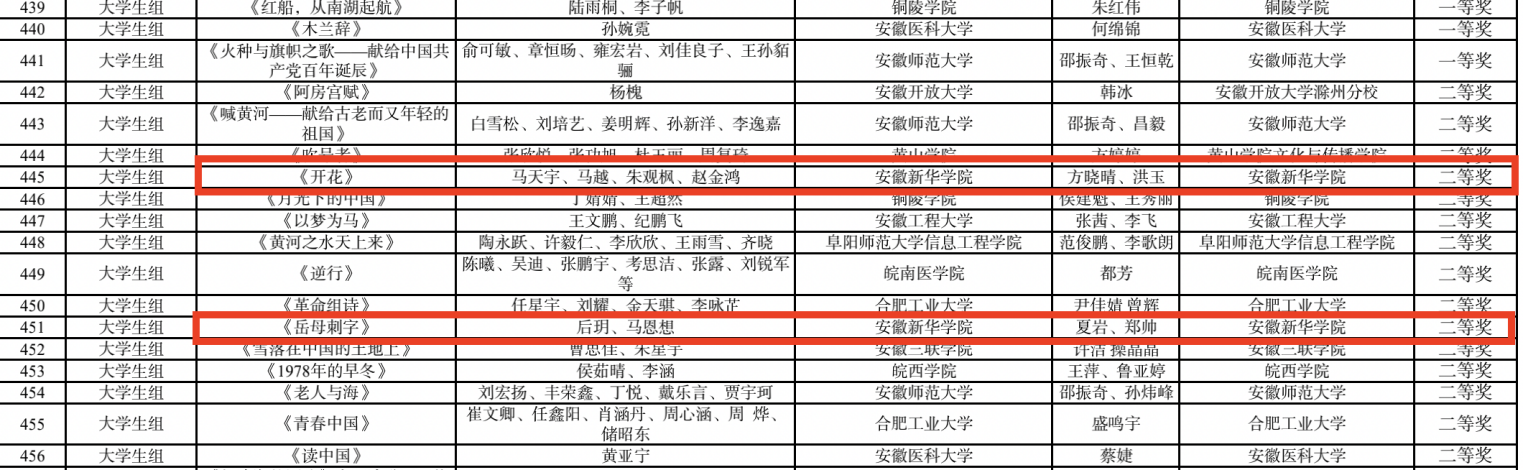 文化与传媒学院老师的作品《开花》《读中国》《闪耀吧,青春的火光》均获得教师组一等奖,这也是红足1世新2登录老师首次三组作品全部入选国赛。文化与传媒学院学生马天宇、马越、朱观枫、赵金鸿的作品《开花》(指导教师:方晓晴 洪玉 )、后玥、马恩想的作品《岳母刺字》(指导教师:夏岩 郑帅)获得大学生组二等奖;张欢欢、魏文杰的作品《青春》(指导教师:翟春翔 方晓晴)获得大学生组三等奖,其中作品《开花》入围国赛。