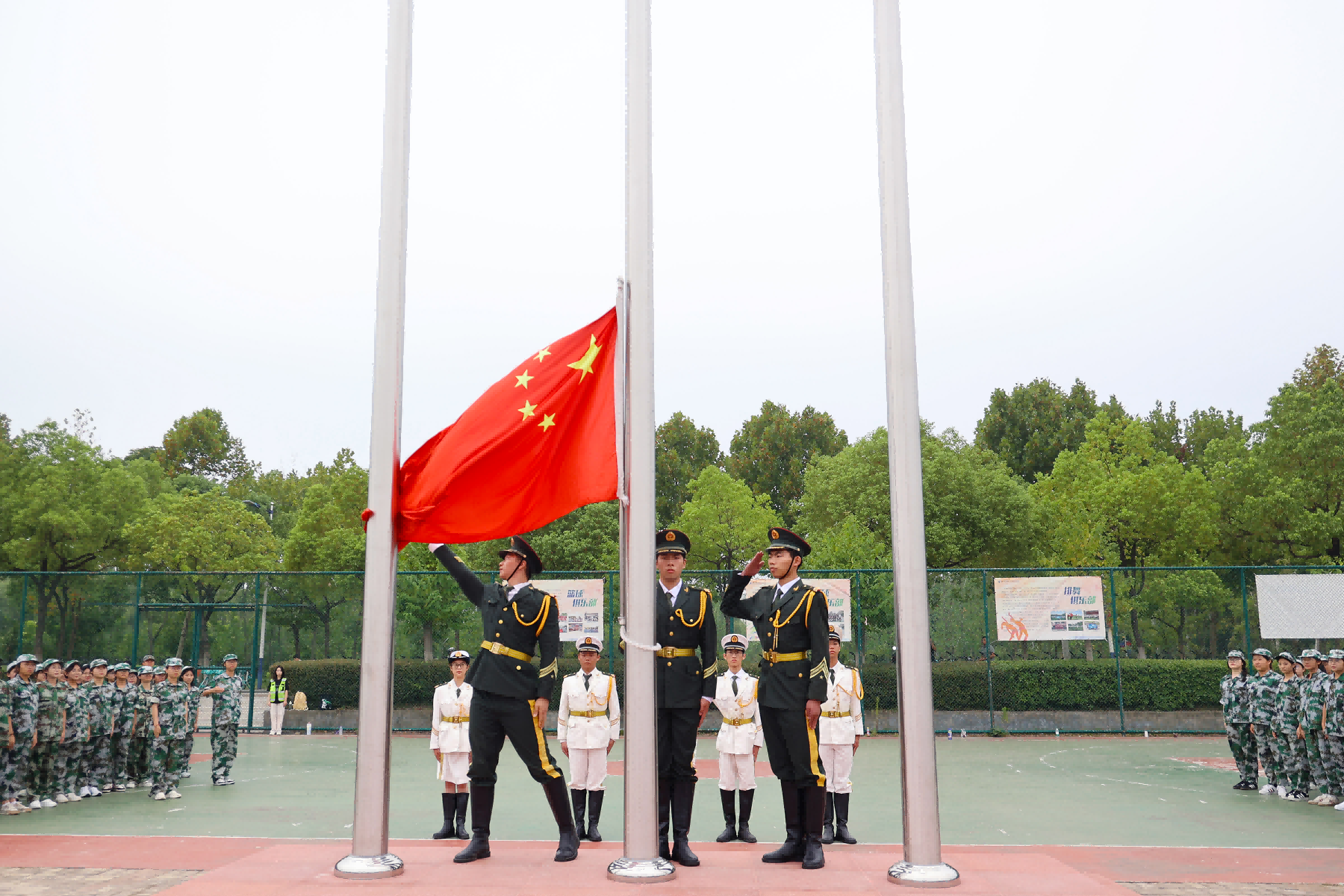 雄壮的国歌声响起,五星红旗在体育场上空高高飘扬,2024级新生开学典礼暨军事训练结营仪式庄严拉开帷幕。