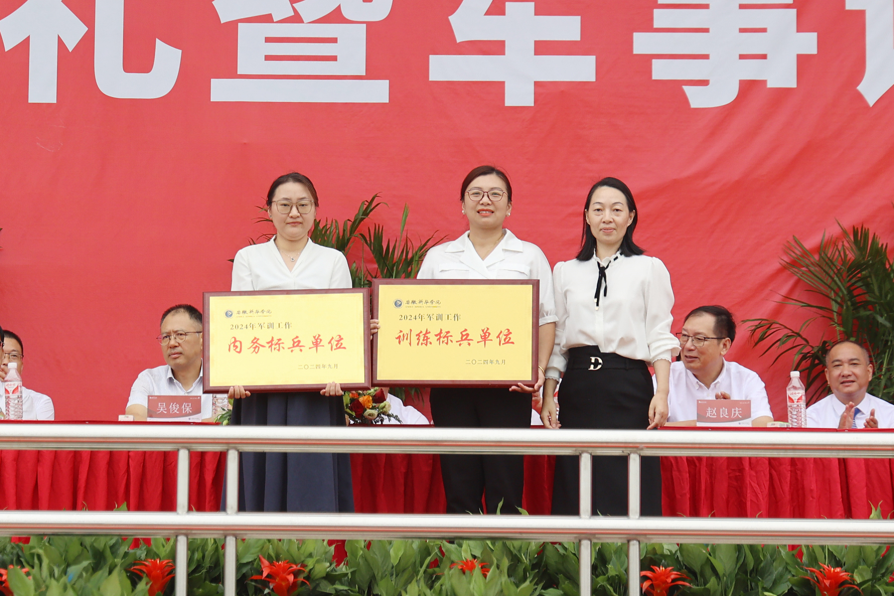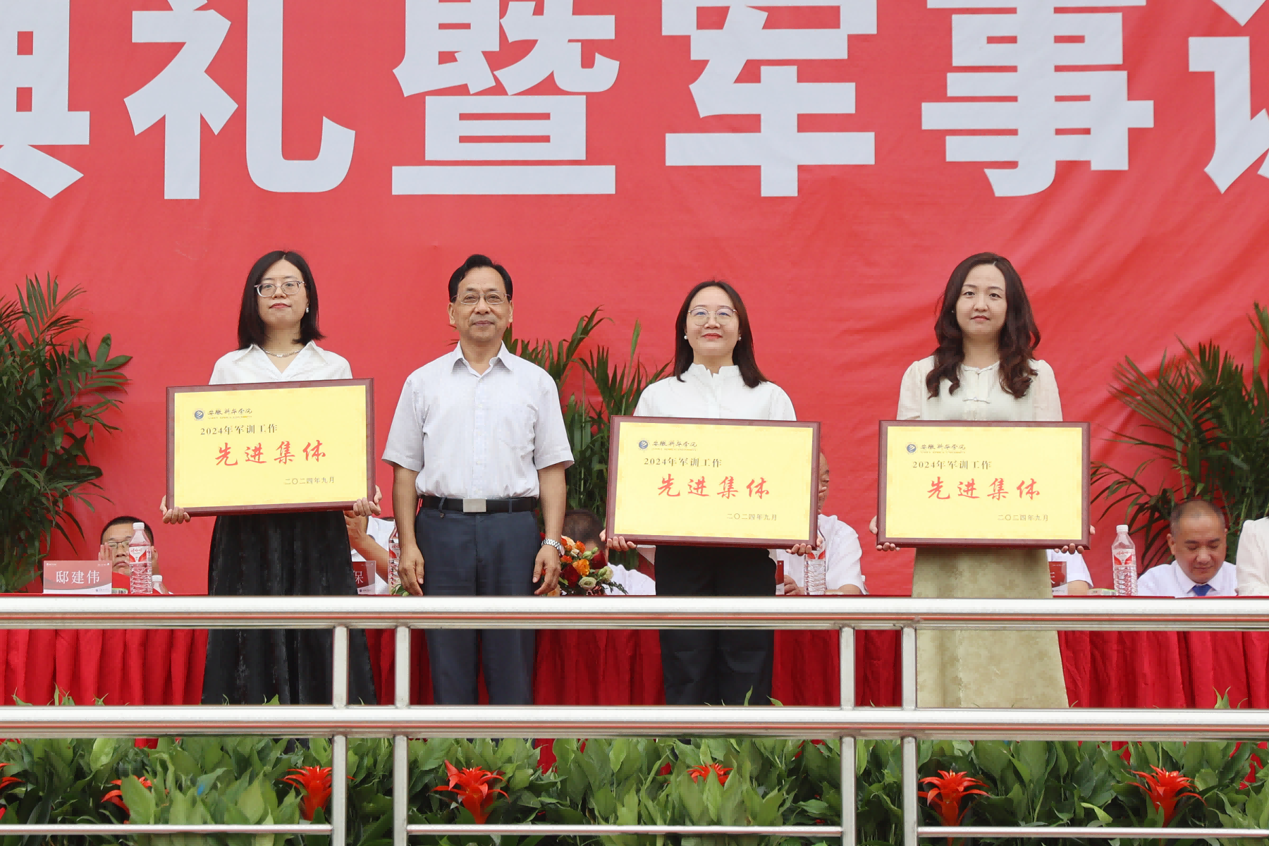 校党委书记邸建伟为获评军训工作“先进集体”的代表颁奖。