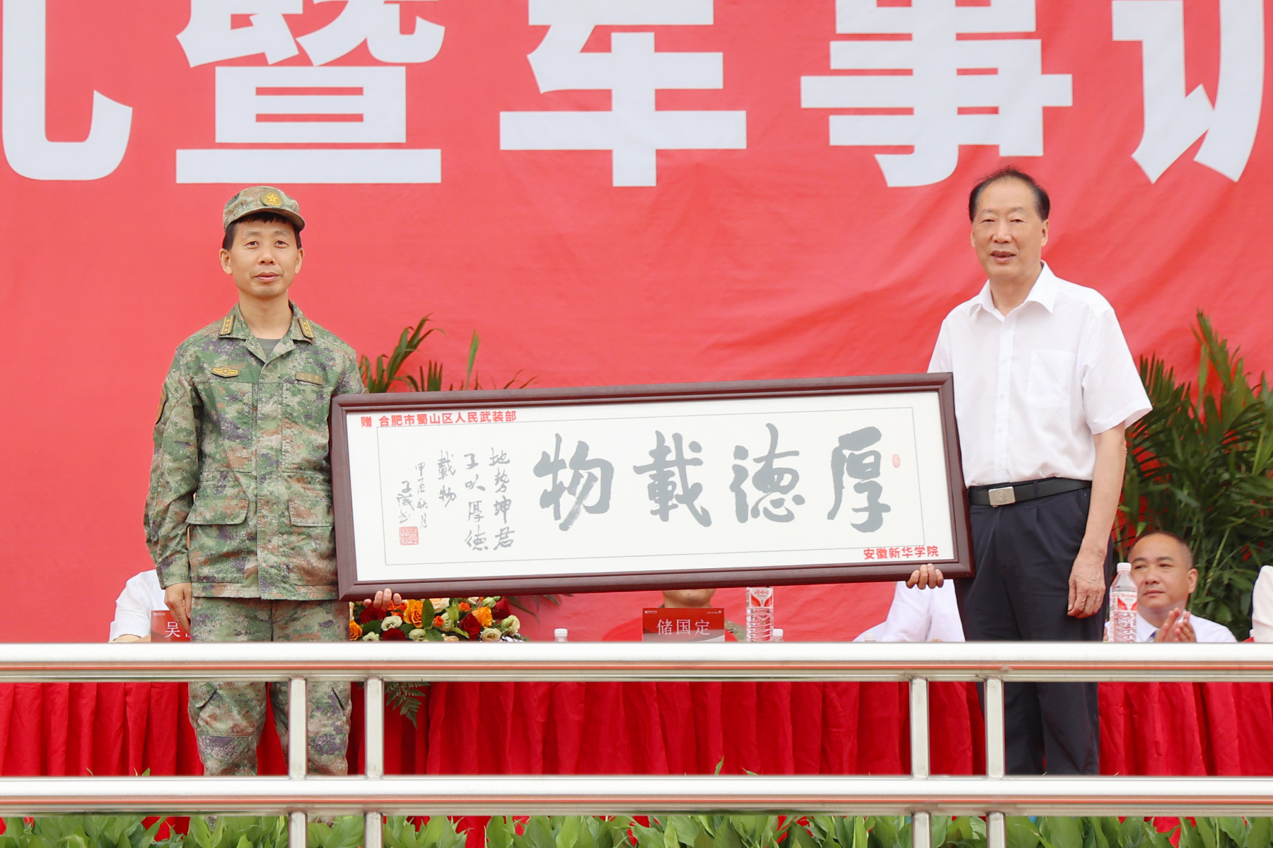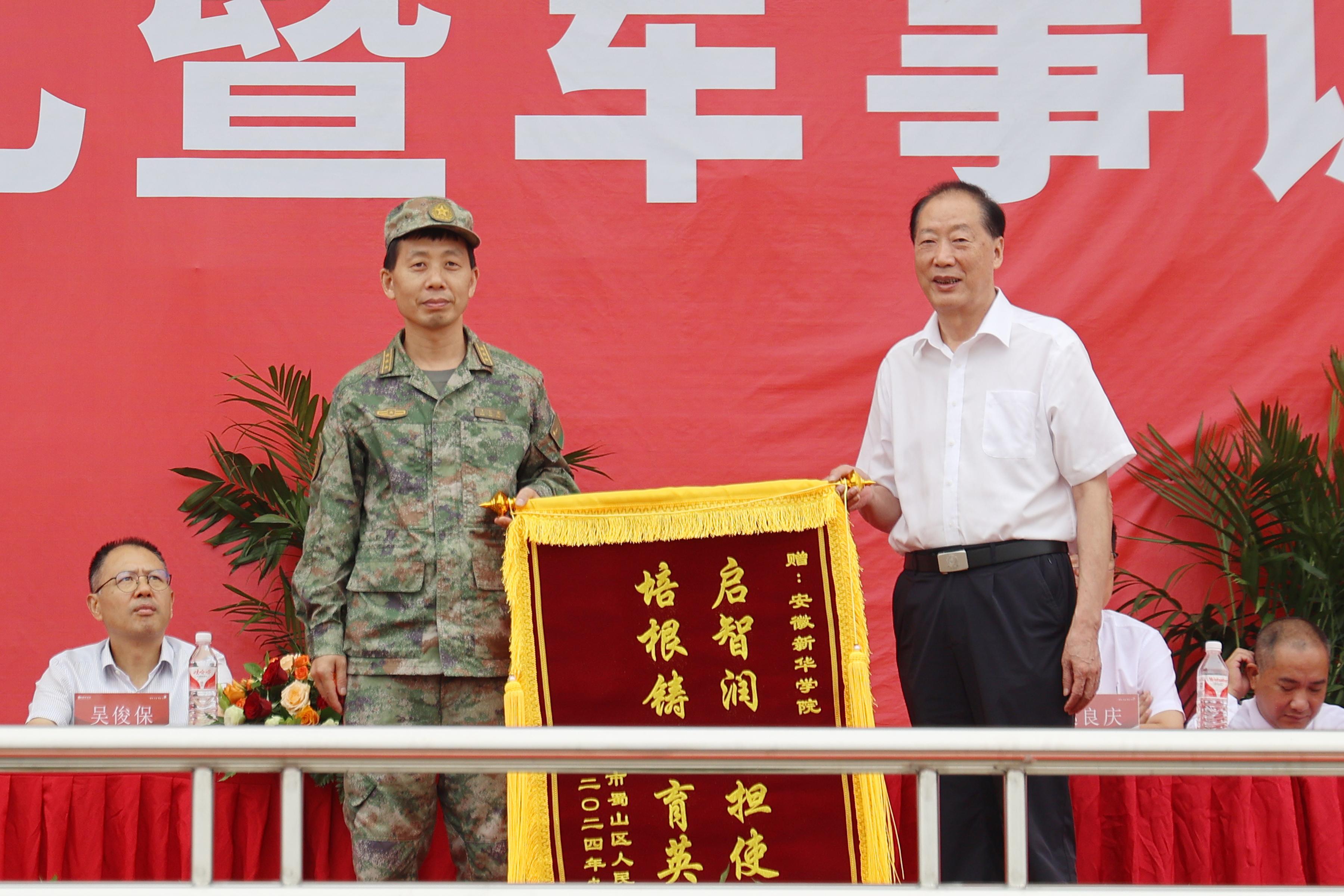 校董事长储国定代表学校向承训部队赠送牌匾,王仁凤代表承训部队向红足1世新2登录赠送锦旗。