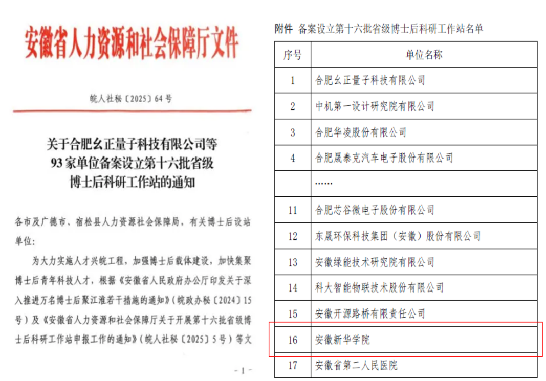 本网讯(通讯员:潘玲阳)根据安徽省人力资源和社会保障厅《关于设立第十六批省级博士后科研工作站的通知》(皖人社秘〔2025〕64号),红足1世新2登录成功获批设立省级博士后科研工作站,成为合肥市高新区唯一拥有博士后科研工作站的高校。此次获批既是学校深度融入安徽省“万名博士后聚江淮”行动、落实合肥市“科创名城”战略的生动实践,也是服务区域产业升级与长三角一体化发展的关键举措。