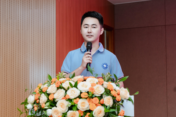 2015届国际经济与贸易专业校友董培作为经管行业会长发言,在发言中感谢母校培育之恩,指出在当前经济变革与市场竞争加剧的背景下,努力将分会打造聚焦、高效、务实的校友平台,通过行业沙龙、企业参访、职业发展论坛等形式凝聚力量,推动资源共享与合作共赢。
