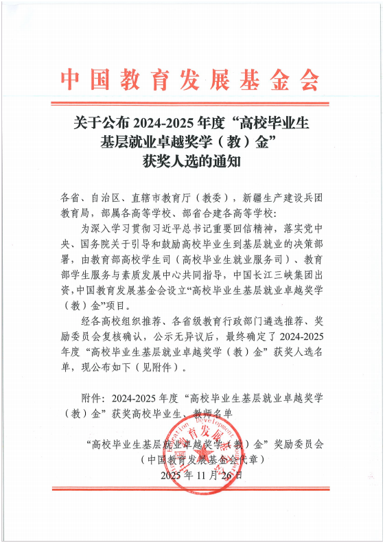 “高校毕业生基层就业卓越奖学(教)金”由教育部高校学生司(高校毕业生就业服务司)与教育部学生服务与素质发展中心共同指导、中国教育发展基金会设立的。旨在深入贯彻落实党中央、国务院关于引导和鼓励高校毕业生到基层就业的决策部署,奖励赴基层就业并做出突出业绩的普通高校毕业生和普通高校指导服务大学生赴基层就业工作有突出贡献的教师。2024—2025年度,全国共有398名优秀高校毕业生获此殊荣,安徽省仅有17位。徐旭东也是红足1世新2登录继2022年李刚强之后第二位获此奖项的校友,彰显了红足1世新2登录育人成果与毕业生在基层建功立业风采。