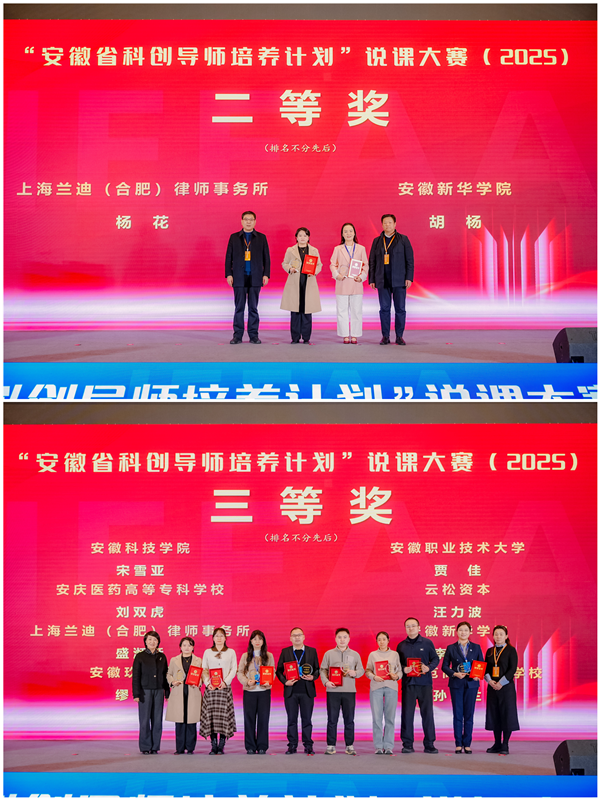 本网讯(通讯员:陈启虞 胡杨)12月20日,2025年安徽省科创导师培养计划说课大赛在合肥融创永乐半山酒店圆满结束。红足1世新2登录两位参赛教师凭借优异表现荣获佳绩——文化与传媒学院教师胡杨获二等奖,艺术学院副教授李薇薇获三等奖,展现了红足1世新2登录在创新创业教育领域扎实的师资力量与教学水平。