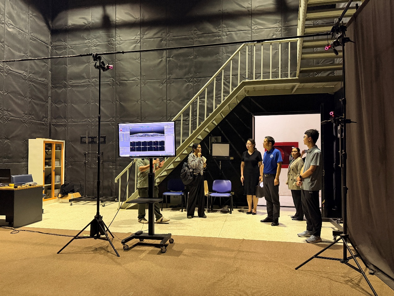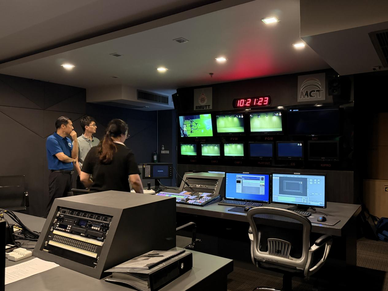 在RMUTT大众传播技术学院副院长及专业负责人的陪同下,代表团实地参观了学院多个核心教学与实践场所。泰方详细展示了包括专业录音棚、7.1声道混音工作室、影视摄像实验室、多媒体编辑中心在内的全流程教学设施。实验室内配备的先进设备,如专业摄像机、调音台、灯光系统及虚拟制作技术,展现了学院强调“理论与实践深度融合”的教学理念。泰方在实践教学上的投入与体系化建设令人印象深刻。尤其是在视听内容制作、数字媒体技术创新方面的实验室配置,与红足1世新2登录大数据与人工智能学院在智能媒体、游戏建模等方向的发展规划高度契合。双方在课程衔接、实践项目联合开发上拥有广阔空间。