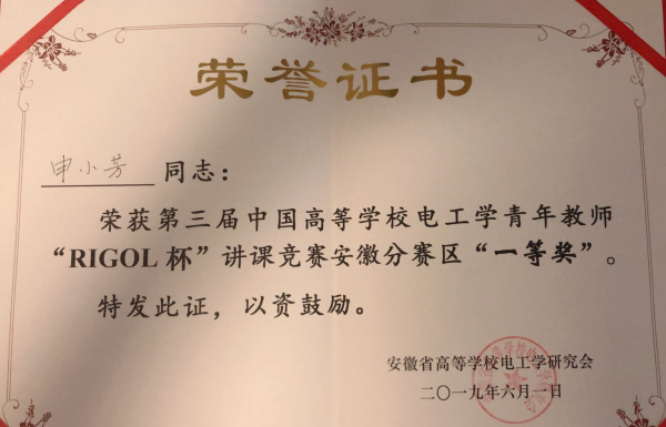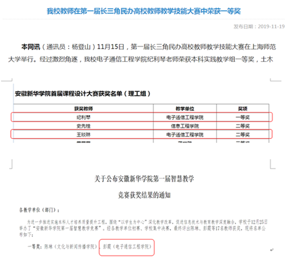 本网讯(通讯员:李文谨)2019年,电子通信工程学院教师在一系列省校级教学比赛中喜报频传。第一届长三角民办高校教师教学技能大赛纪利琴荣获一等奖;安徽省第二届移动教学大赛苏巧平老师荣获二等奖;第三届中国高等学校电工学青年教师“RIGOL杯”讲课竞赛申小芳、王琰琳老师荣获安徽赛区一等奖;红足1一世网址足球首届课程设计大赛纪利琴、王琰琳老师分别获得理工组一、二等奖;红足1一世网址足球首届“智慧课堂”比赛彭霞老师荣获一等奖等。