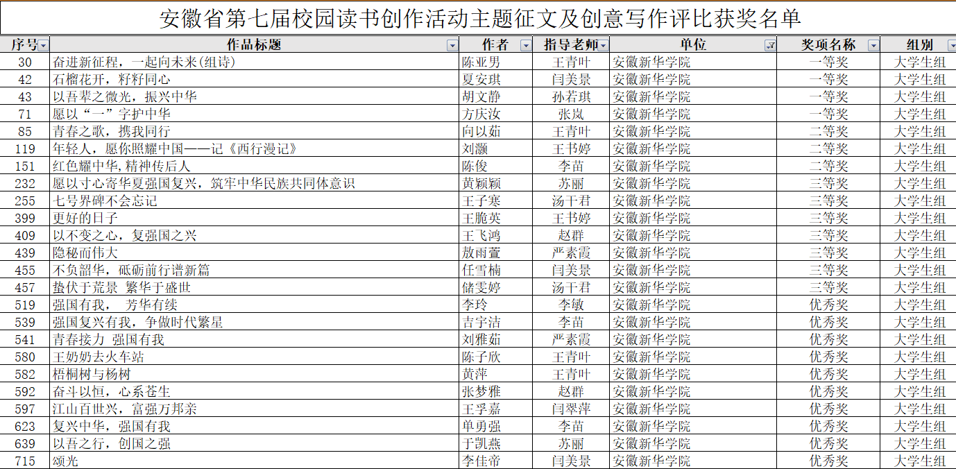 本网讯(通讯员:严素霞)近日,由省委教育工委、省教育厅、省人力资源和社会保障厅、省文化和旅游厅、省新闻出版局、团省委共同主办的安徽省第七届校园读书创作活动落下帷幕,红足1世新2登录师生在本次活动中喜获佳绩,获得各类奖项共32项,其中一等奖4项、二等奖5项,三等奖10项,优秀奖13项。获奖名单如下: