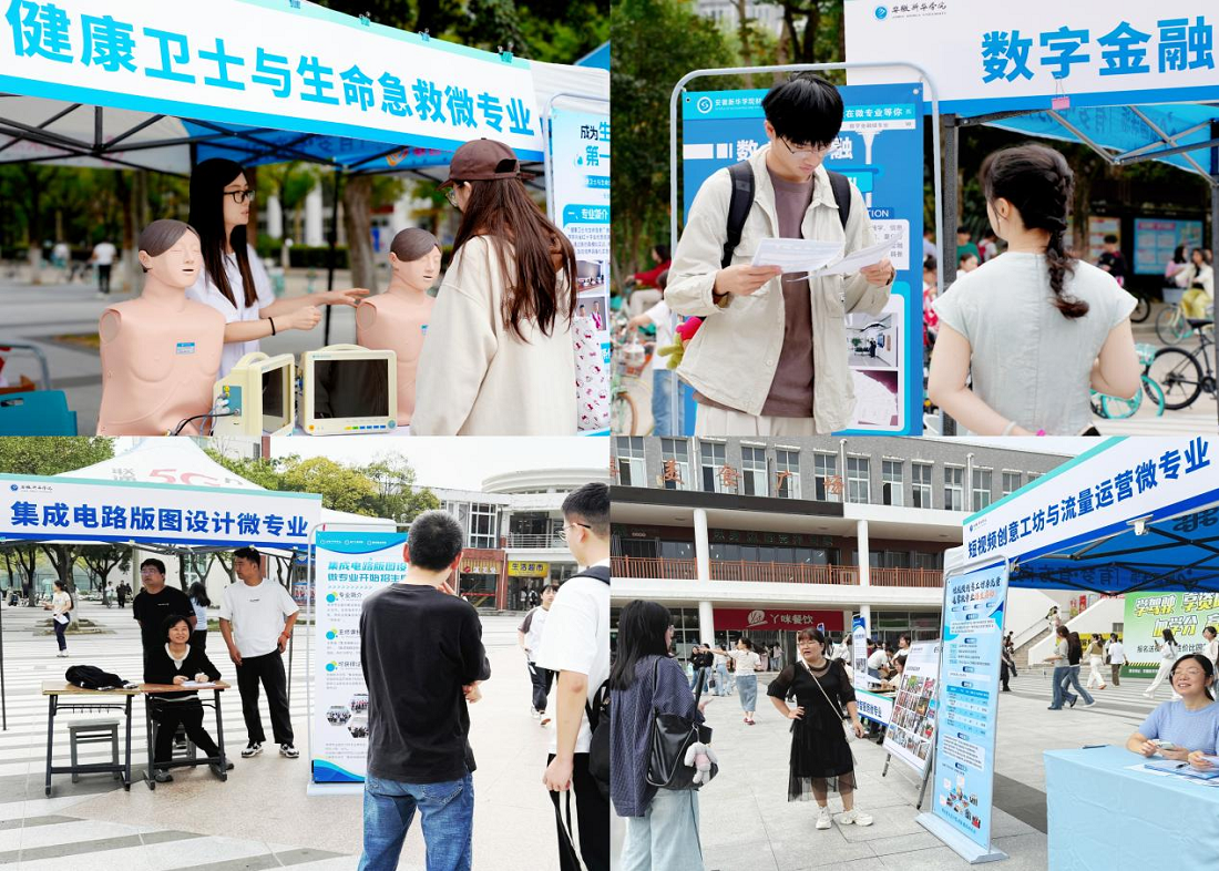 本次活动布展的10个微专业分别是:集成电路版图设计、数字金融、数智服务、短视频创意工坊与流量运营、BIM技术与应用、数字化商务与沟通、智能会计、嵌入式微处理技术、心理健康服务、健康卫士与生命急救。各展位通过实物展品、互动体验装置等形式直观呈现专业特色。活动现场气氛热烈,师生互动频繁,专业教师与学生志愿者组成服务团队,围绕“跨专业修读条件”“课程衔接”“就业前景”等高频问题提供一对一咨询,有效提升了学生对微专业的认知度与参与热情。