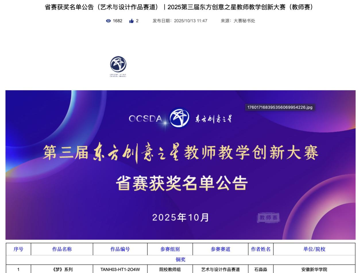 本网讯(通讯员:朱毅) 近日,第三届东方创意之星教师教学创新大赛省赛获奖名单正式发布,我院教师石淼淼凭借作品“《梦》系列”获艺术与设计作品赛道省赛铜奖。