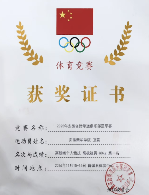 本次赛事是安徽省跆拳道领域颇具影响力的群众性竞技赛事,吸引了全省各地30支俱乐部队伍、数百名运动员同台竞技。面对经验丰富的强劲对手,卫震始终保持沉着冷静的心态,在攻防转换中精准把握战机,动作舒展有力、战术运用灵活。从小组赛到决赛,他历经多轮高强度比拼,凭借稳定的发挥逐一击败对手,最终脱颖而出,成功摘得高校组男子80公斤级桂冠,充分展现了新时代大学生精湛的竞技水平和永不言弃的体育精神。