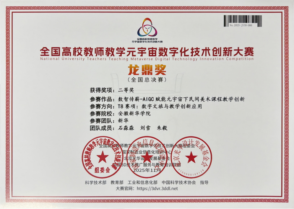 本网讯(通讯员:朱毅)近日,第六届全国高校教师教学元宇宙数字化技术创新大赛颁奖盛典在北京召开。我院石淼淼、刘雪、朱毅三位教师组成的教学团队,凭借其创新的教学设计、扎实的专业功底和出色的表现,最终在高校教师组赛道中脱颖而出,荣获国家级二等奖。