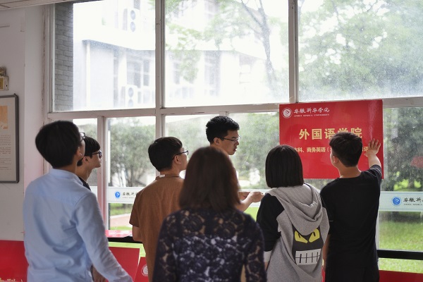 9日6日上午,外国语学院门口中、英、日三种语言的迎新喷绘吸引新生和家长们的驻足。阳光下,风雨中,合影留念记录了大学入校第一天的美好心情。一楼大厅简洁明了的报到流程、家长休息室、行李暂存处、党员服务台、专业咨询室、助学贷款办理处,处处显真情。